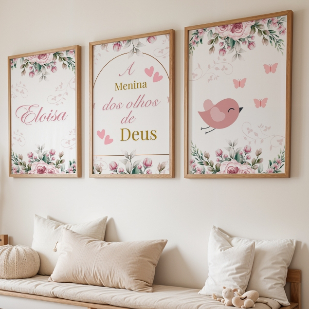 Kit Quadro Decorativo COM OU SEM MOLDURA 3 peças com nome personalizado frase bíblica flores e passarinho borboleta