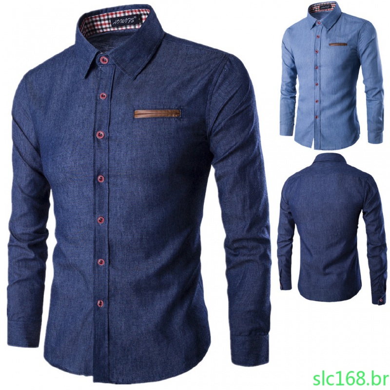 Camisa Social dos homens Camisa Jeans Manga Longa Camisa de Couro Manga Longa dos homens Com Bolsos Para O Verão 69478