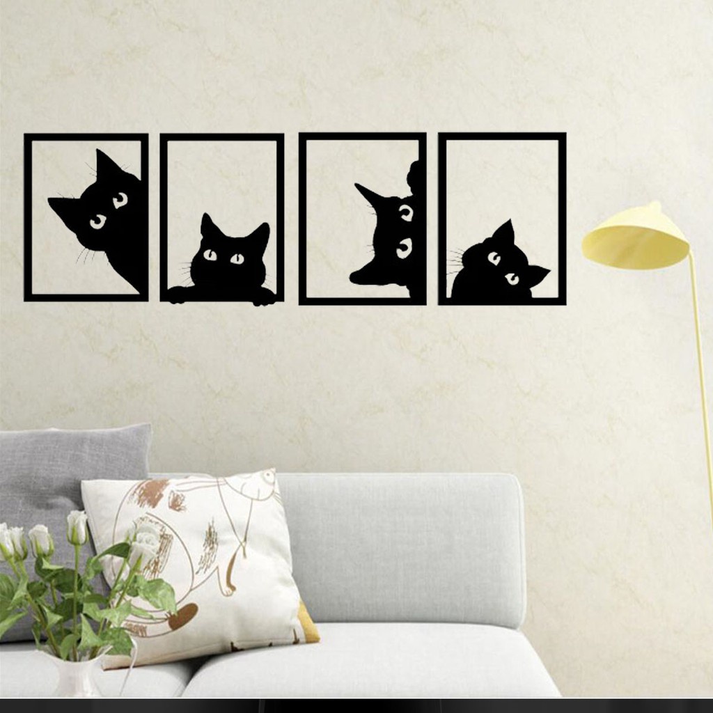 Kit 4 Quadros Vazados Gato Preto Cat Decorativo Mdf Escultura de Parede Casa Sala Quarto Pet