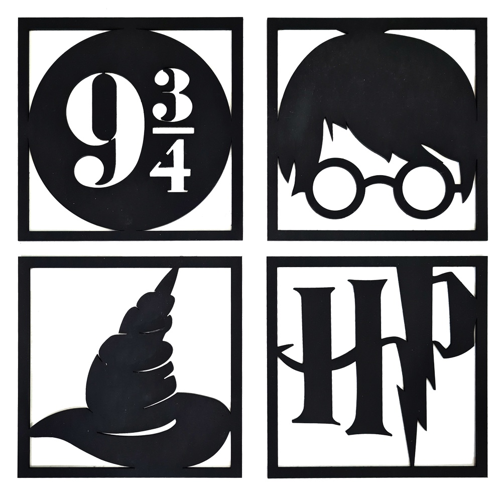 Kit 4 Quadros Vazados Decorativos Harry Potter em MDF 20x20 Preto