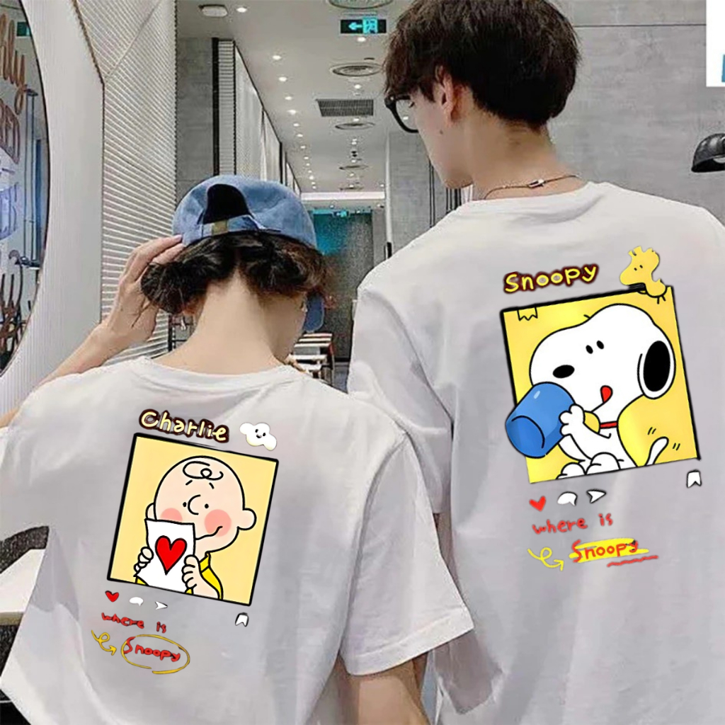 Camiseta de Casal Estampada Cartoon Snoopy e Charlie 100% Algodão Premium Streetwear Estampada na Frente e Nas Costas