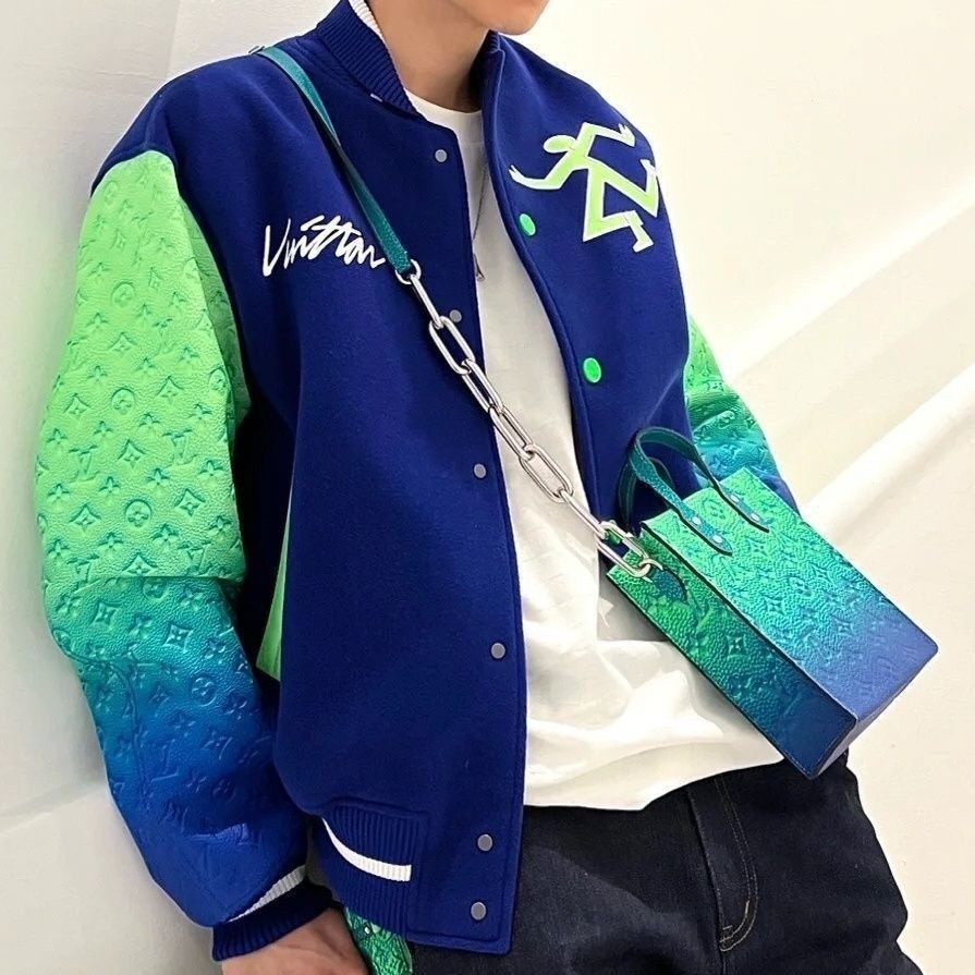 Louis Vuitton 2023 Gaudin 22ss mostra Klein gradiente piloto joystick azul costura jaqueta de manga pesada de couro impresso