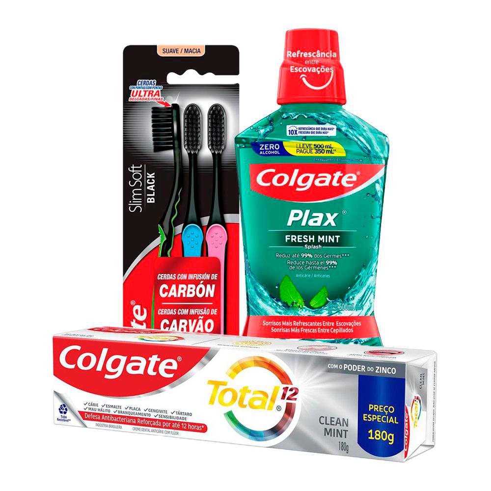 Kit 3 Escovas Colgate Slim Soft Black + Creme Dental Clean Mint 180g + Enxaguante Bucal Fresh Mint 500ml