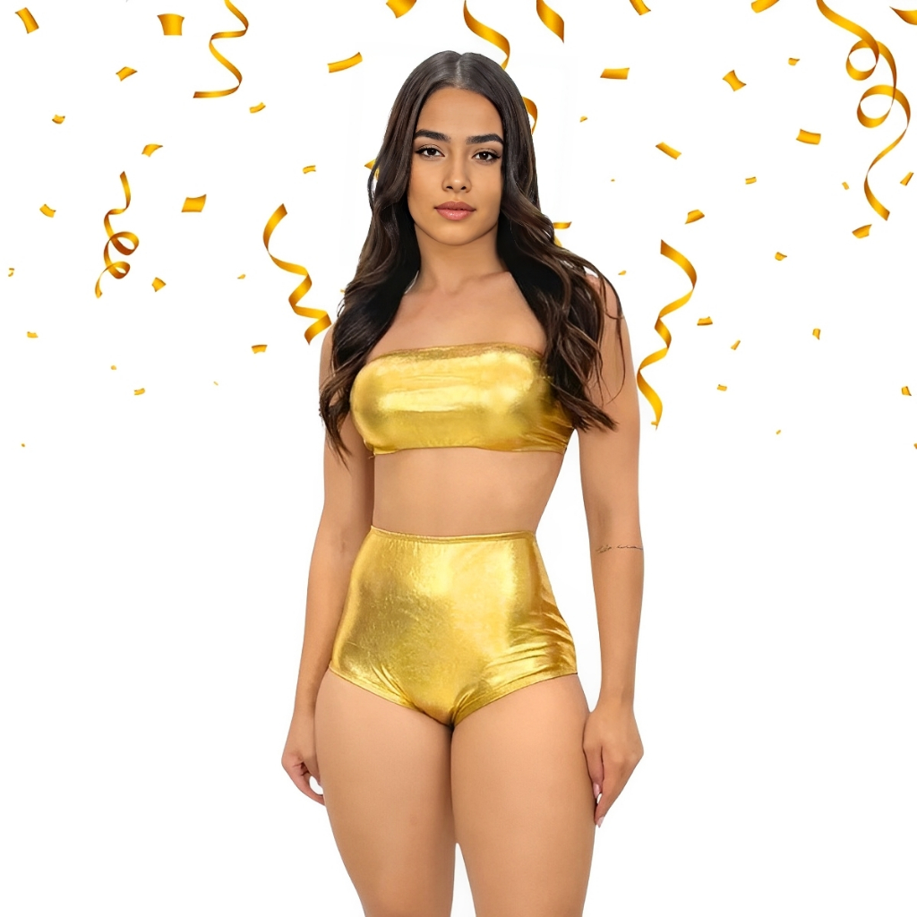 Conjunto 2 Peças Metalizado Carnaval Calcinha Top Faixa Shorts Cropped Brilhoso Festa Piscina Fantasia Hot Pants feminin
