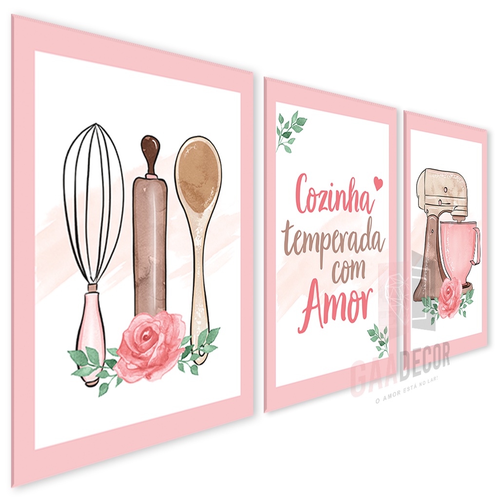 Kit 3 Placas Decorativas Quadros Para Cozinha Kitnet Rosa Temperada com Amor Pequena