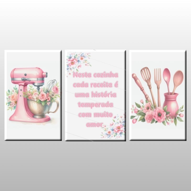 Kit 3 quadros decorativos para cozinha rosa - modelo 1