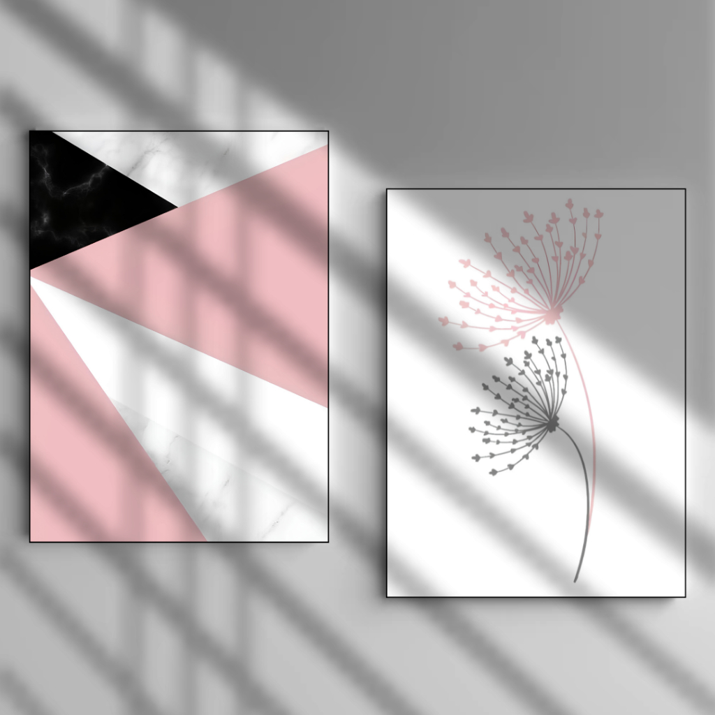 Kit 2 Quadros Decorativos 20x28 ou 21x30 Arte Geométrica e Flores, Decoração Tons Rosa e Cinza, Arte Moderna Para Quarto, Sala, Escritório, Cozinha MDF