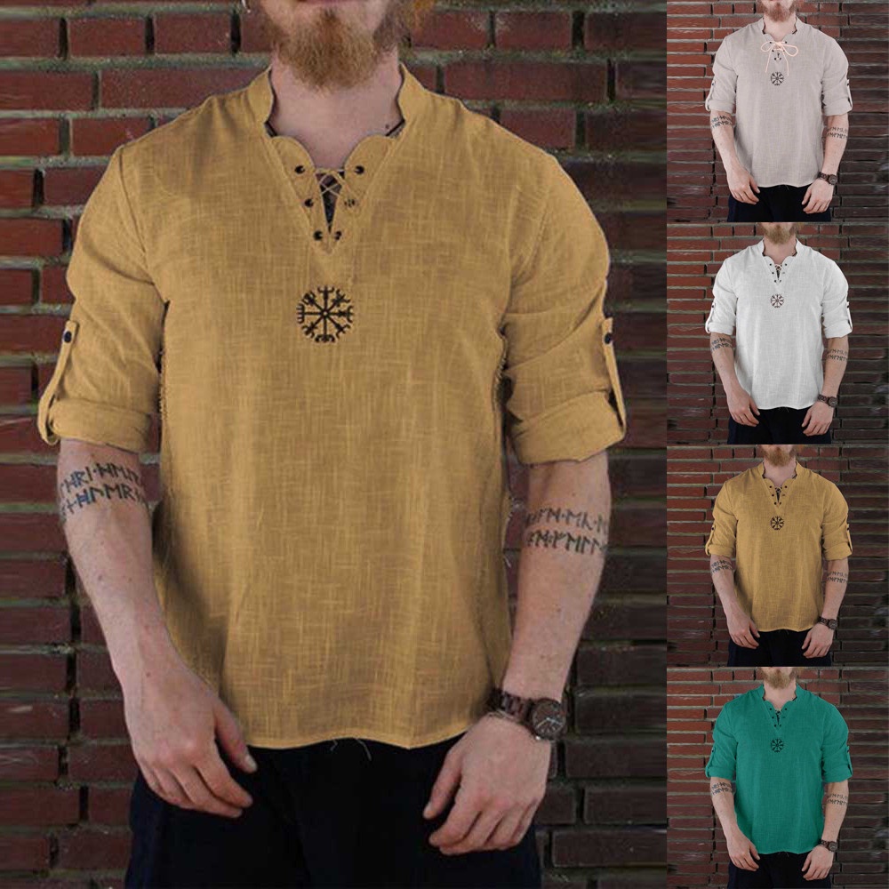 Hot 🔥Quente🔥 2023 Camiseta Masculina De Linho Pirata Viking Medieval Nórdico Cosplay Com Cadarço Cosplay Tee