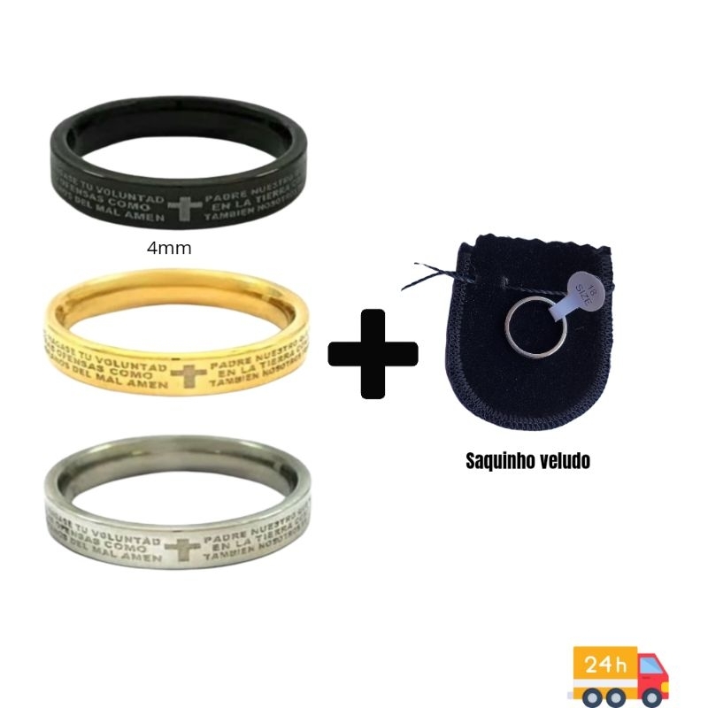 Anel aço inoxidável Pai Nosso inox 4mm largura religioso aliança oração aneu feminino masculino prata dorado preto anel fino banhado não enferruja nem desbota