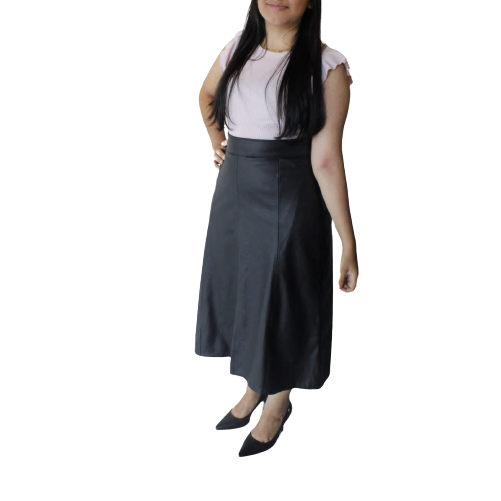 Saia Evangélica Midi de Couro Evasê Ziper Invisível No Couro Com Recortes Verticais e Horizontal