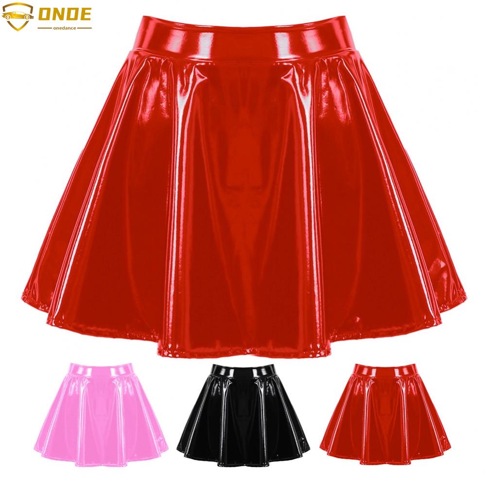 [ONDE] Minissaia feminina de couro envernizado brilhante, saia evasê de dança, roupa de balada, cosplay
