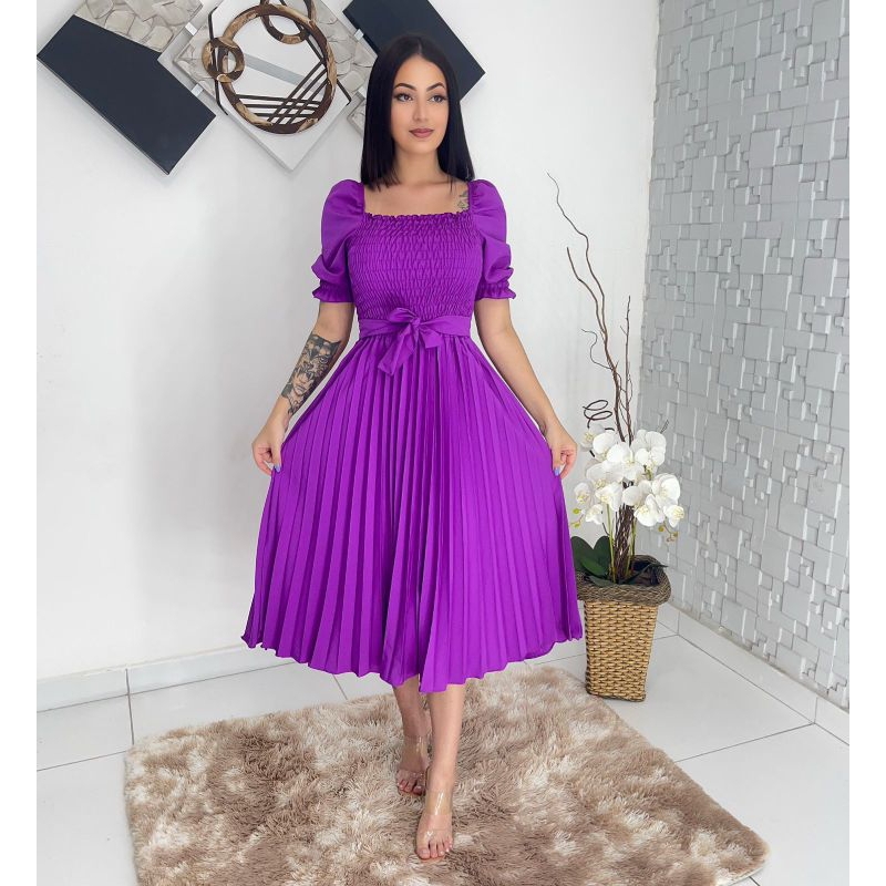 Vestido Midi Feminino De Manga Curto Plissada lisa