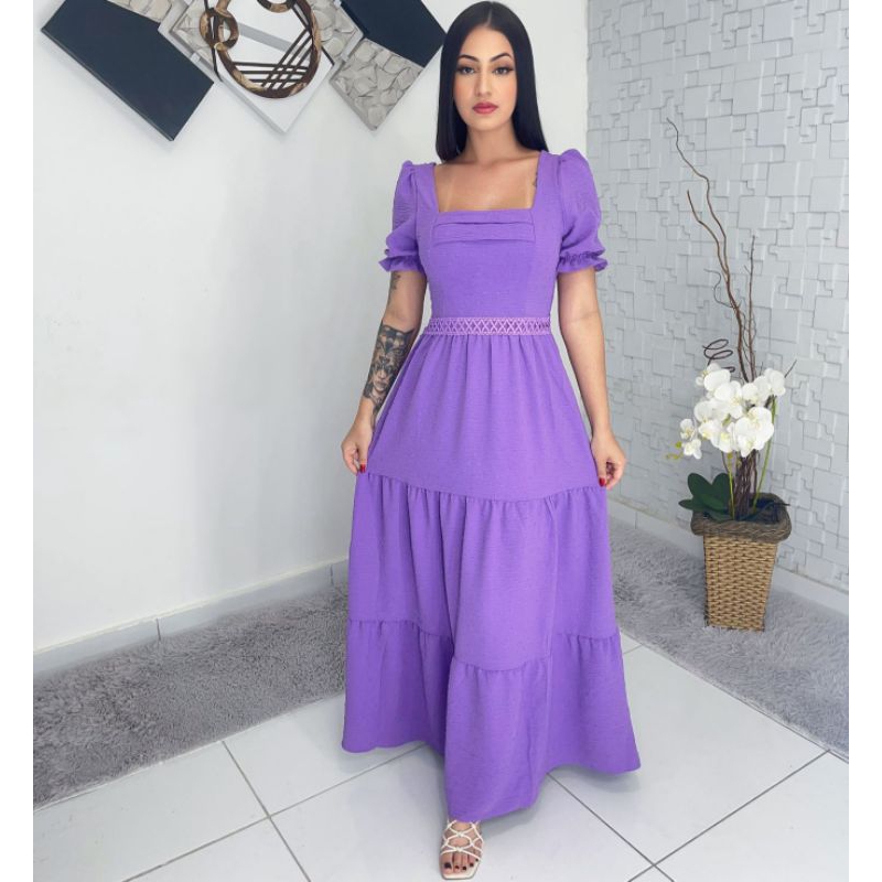 Vestido longo no tecido dunas todo forrado na helanca manga curta com lindo detalhe em guipir e elasteque detalhe de gola polo saia 2 maria acompanha faixa do mesmo tecido moda evangélica