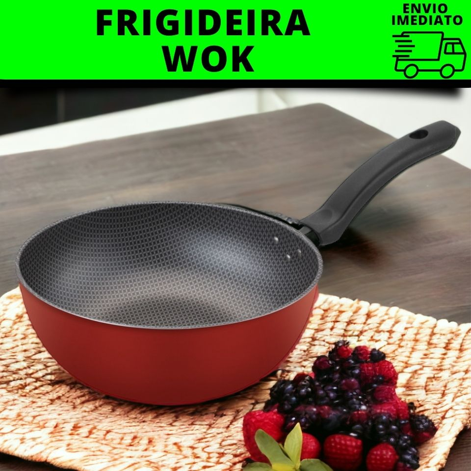 Panela Frigideira Wok 24cm Vermelha Antiaderente Grande Redonda Funda Alumínio Cabo Baquelite Antitérmico s/ Tampa