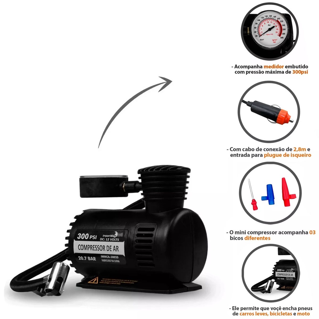 Compressor Veicular De Ar Mini Elétrico Portátil Prata 12V Com Manômetro Encher Pneu Bicicleta, Carro, Caminhão, Onibus, Vans Alta Pressão Com 3 Bicos Para Inflar