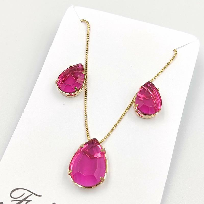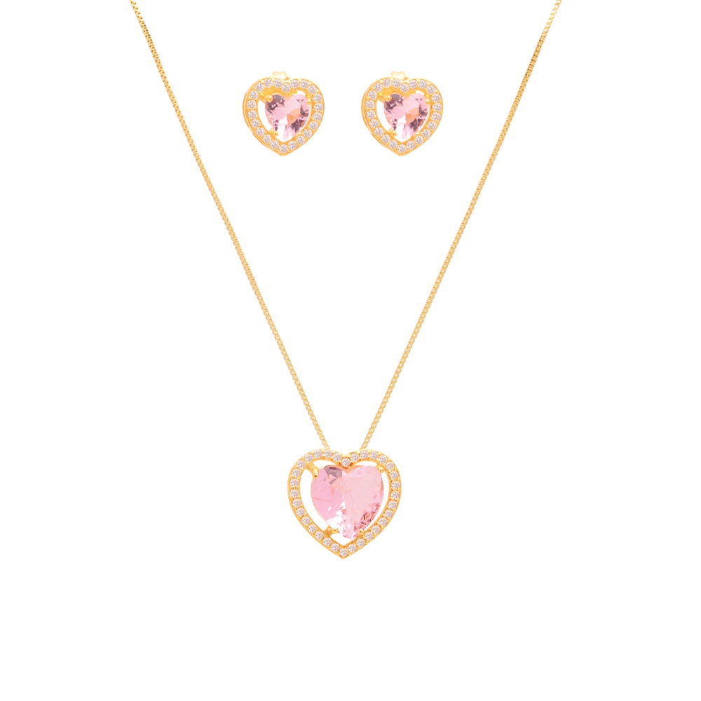 Conjunto Colar E Brinco Coração Pedra Rosa Folheado A Ouro