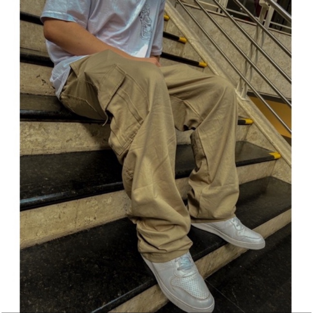 Calça Cargo Skate Streetwear Retro 6 Bolsos Boca Larga Unissex
