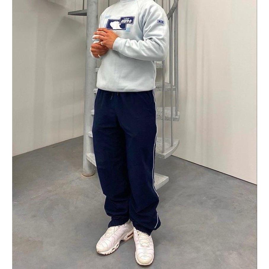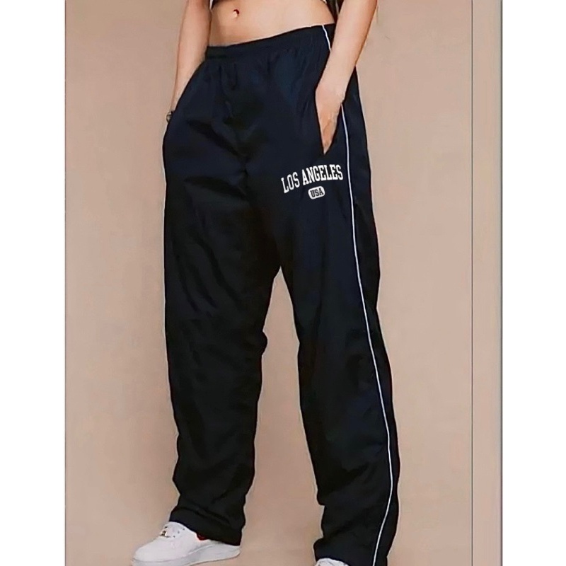 Calça básica estilo street reta larga de tactel com ajuste de cordão na cintura e bolsos- masculina feminina cor azul e preta