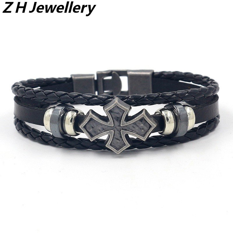 [Z H Jewelry] Vintage Rock Cross Pulseira Religiosa De Couro Moda Masculina E Feminina Aço Inoxidável Com Múltiplas Camadas De PU Punk Party Accessories