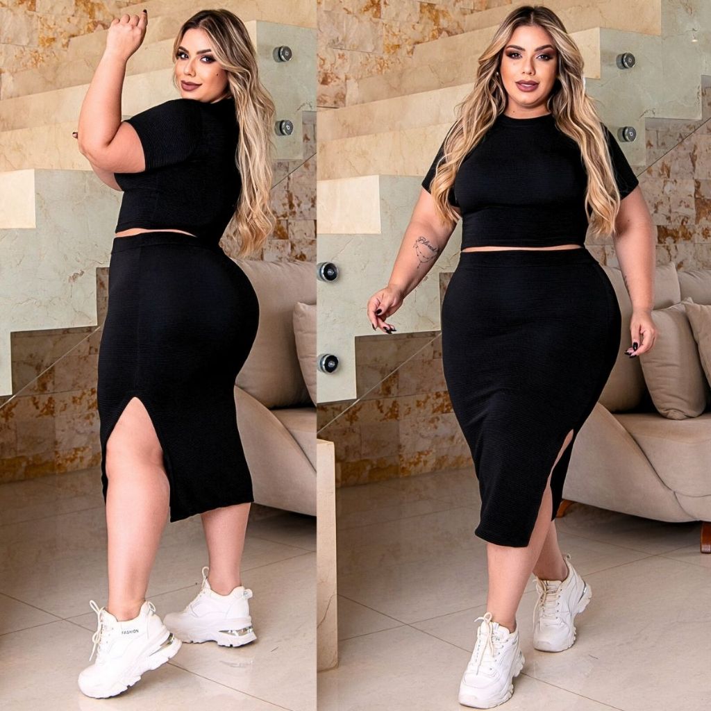 Conjunto Feminino Saia Plus Size Com Fenda Lateral Cropped Manga Curta até 52
