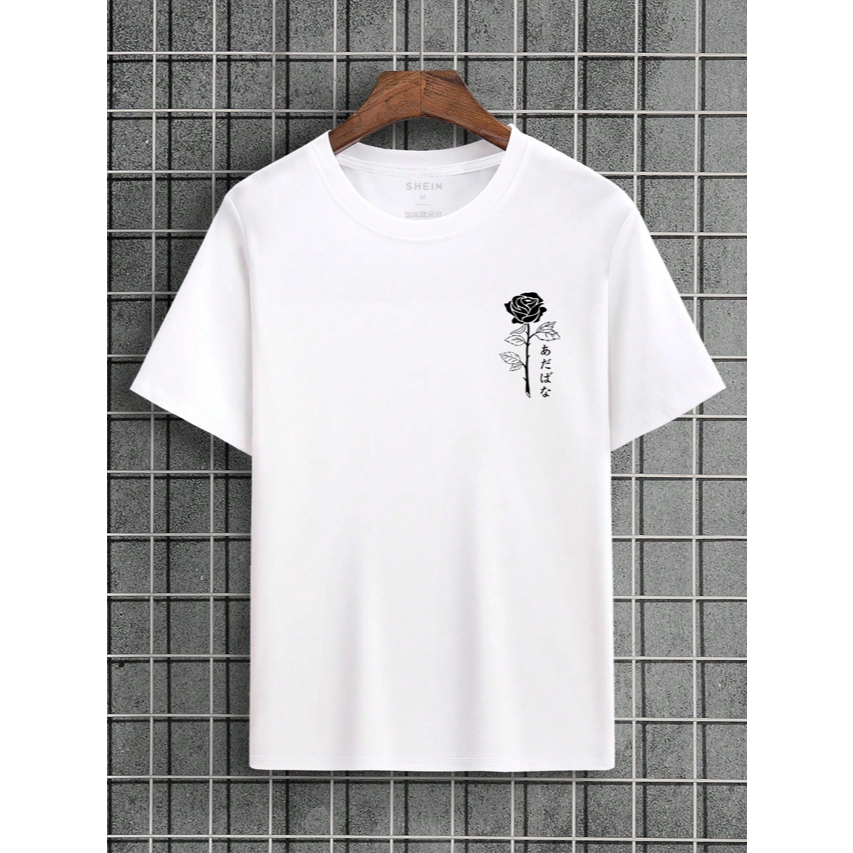Camiseta Desenho Rosa Estampa Grafica Bordado Frente Letras Japonesas Aesthetic Blusa Manga Curta Ombro Caido Unissex