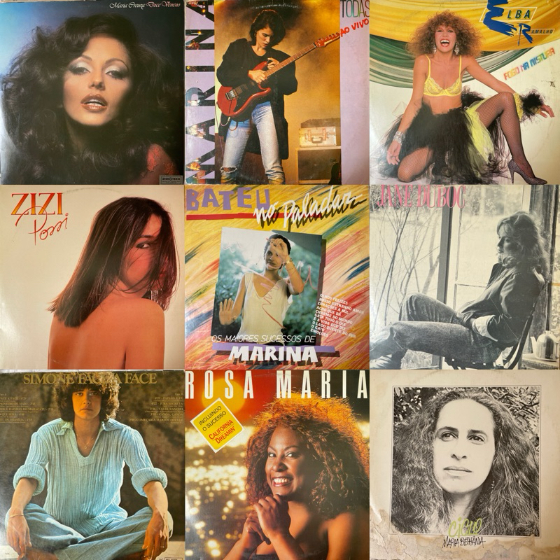 LPs Cantoras Nacionais: Maria Creuza: Doce Veneno / Marina: Todas ao vivo/ Elba Ramalho: Fogo na Mistura/ Jane Duboc/ Zizi Possi/ Marina: Melhores Sucessos (Bateu no Paladar)/ Rosa Maria/ Simone: Face a Face/ Maria Bethânia: Ciclo