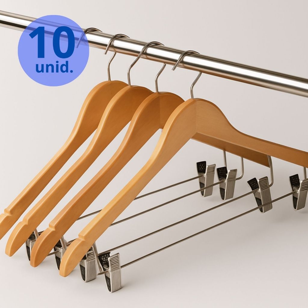 Kit 10 Cabides Madeira Com Presilha Adulto Saia Vestido Calça Bermuda Reforçado
