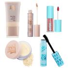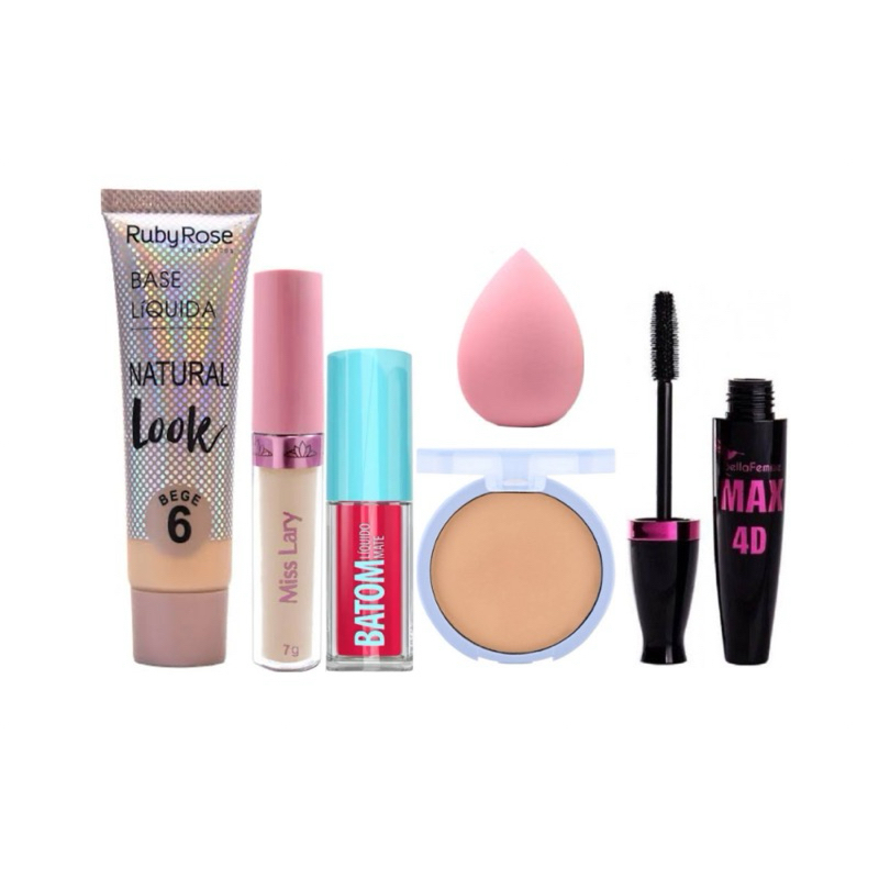 Kit de Maquiagem Base, Iluminador ou Corretivo, Pó, Esponja, Batom e Rímel para Iniciantes Revenda
