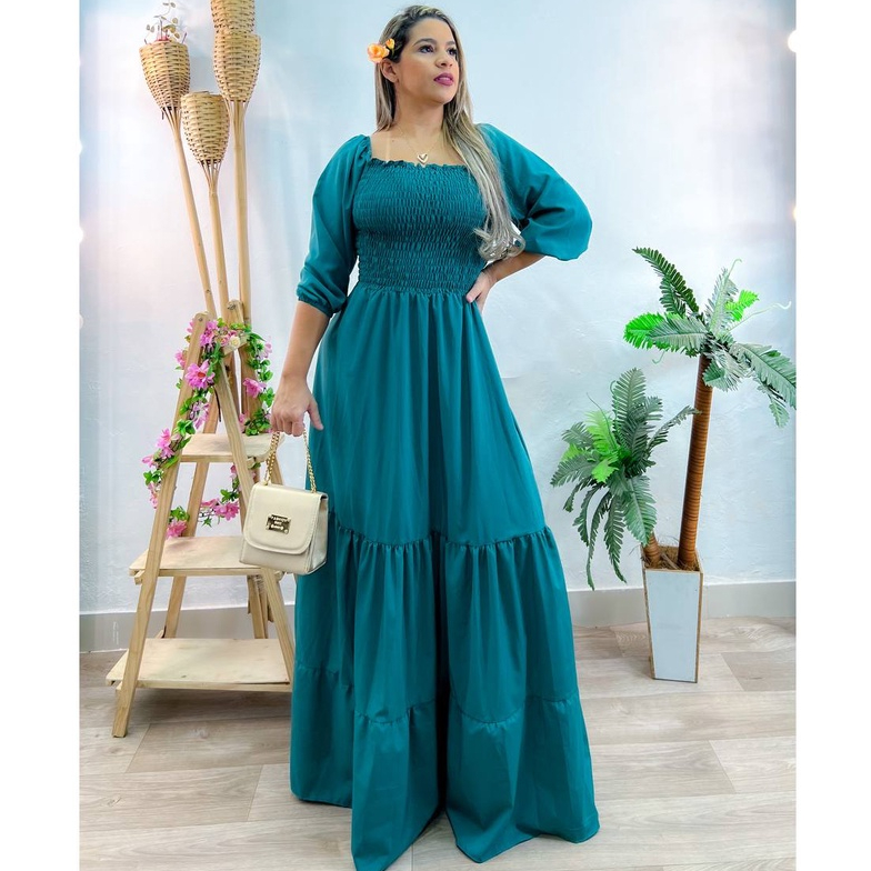 Vestido longo moda cristã feminino em Viscose/Viscolinho casual de alça Muito Lindo com elástico.