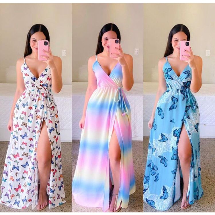 Vestido Longo com alça regulável Fenda costas de Elastex ESTAMPADO Moda verão REF: 01