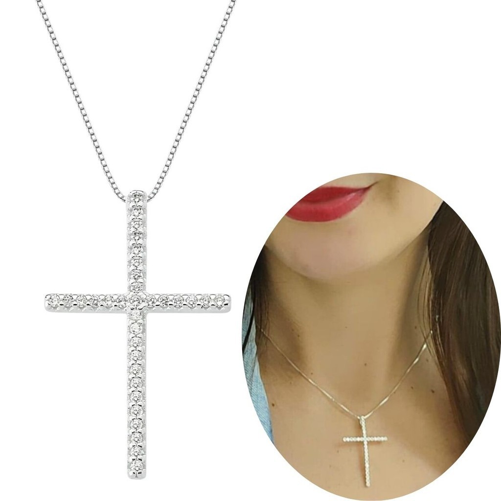 Colar com pingente cruz grande cravejada prata 925 legítima