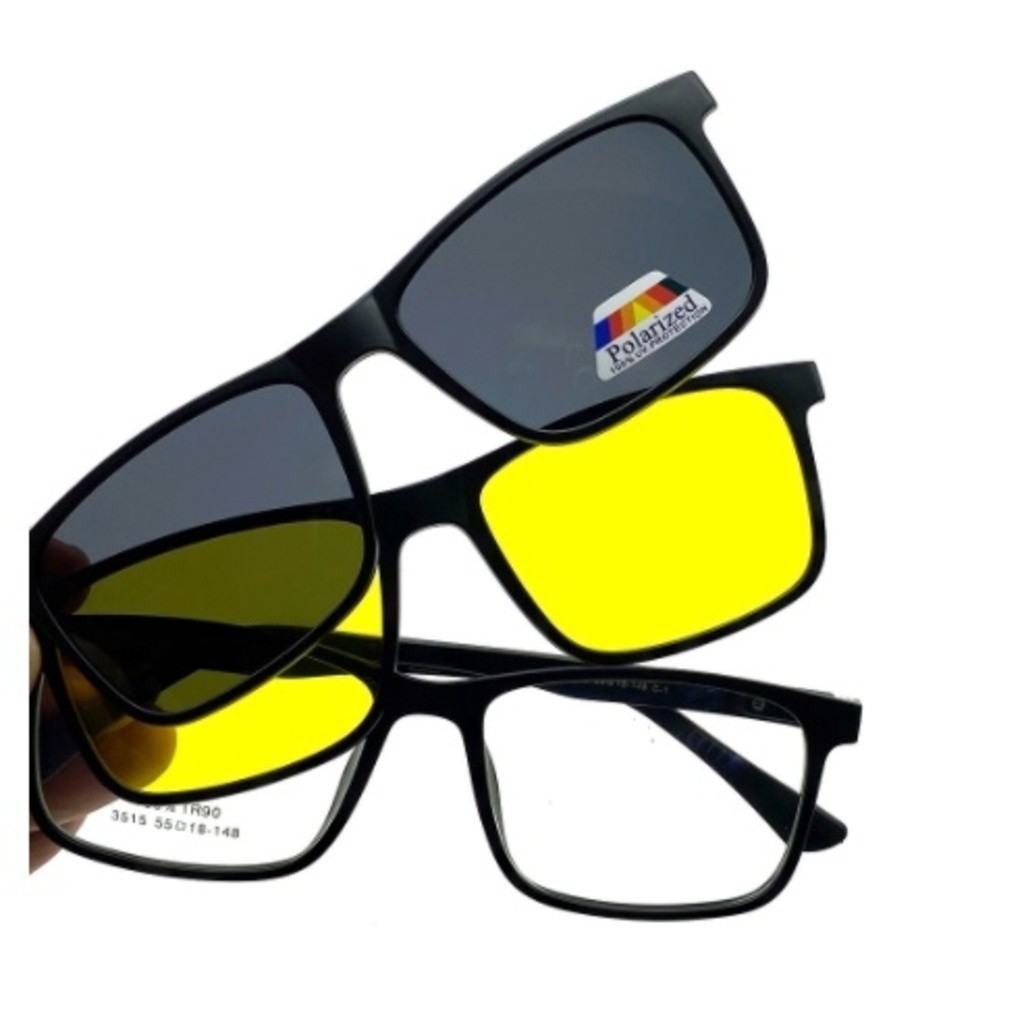 Armação de Oculos Grau e Sol Preto Polarizado Clip On 3 em 1 Masculino Troca Lente Amarelo Dirigir a Noite Mod 2249