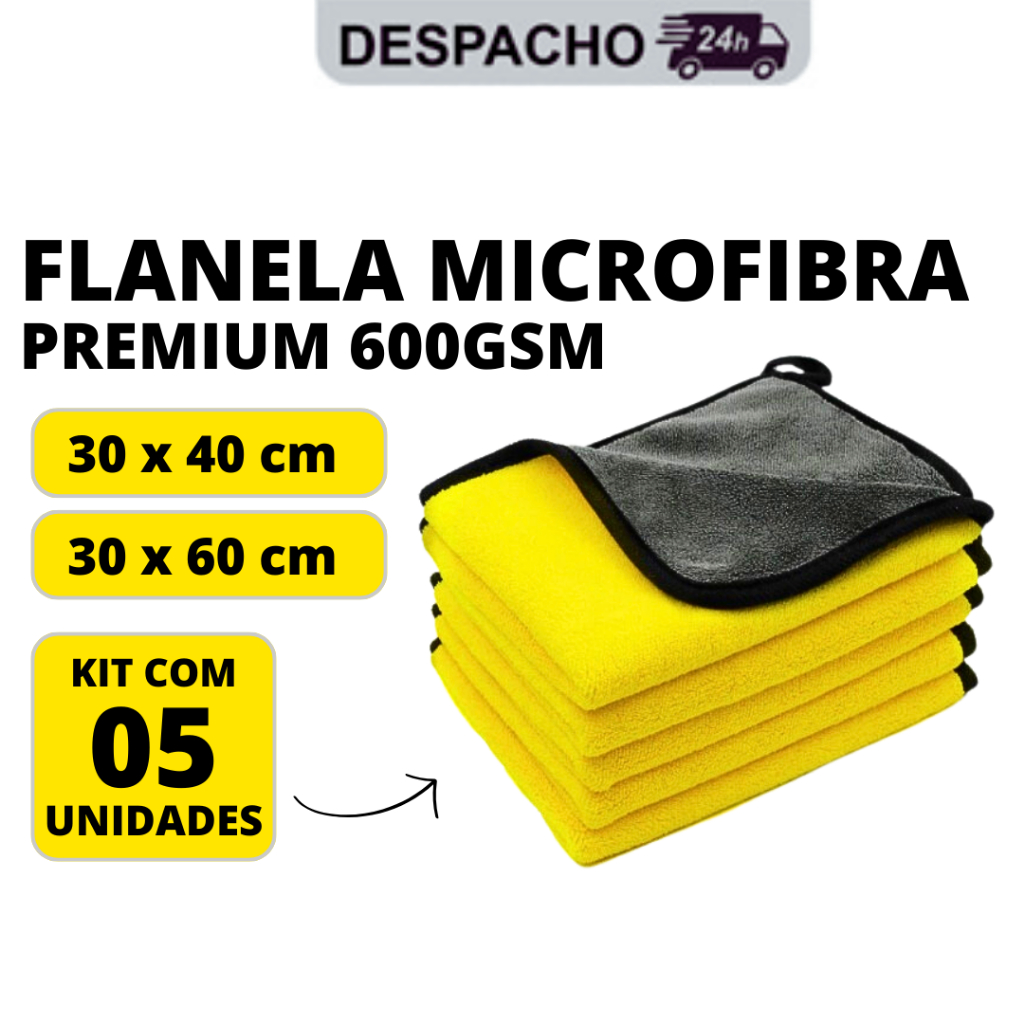 Kit 05 Flanela Microfibra Automotiva 30x40 30x60 600GSM Premium Para Lavagem de Carro