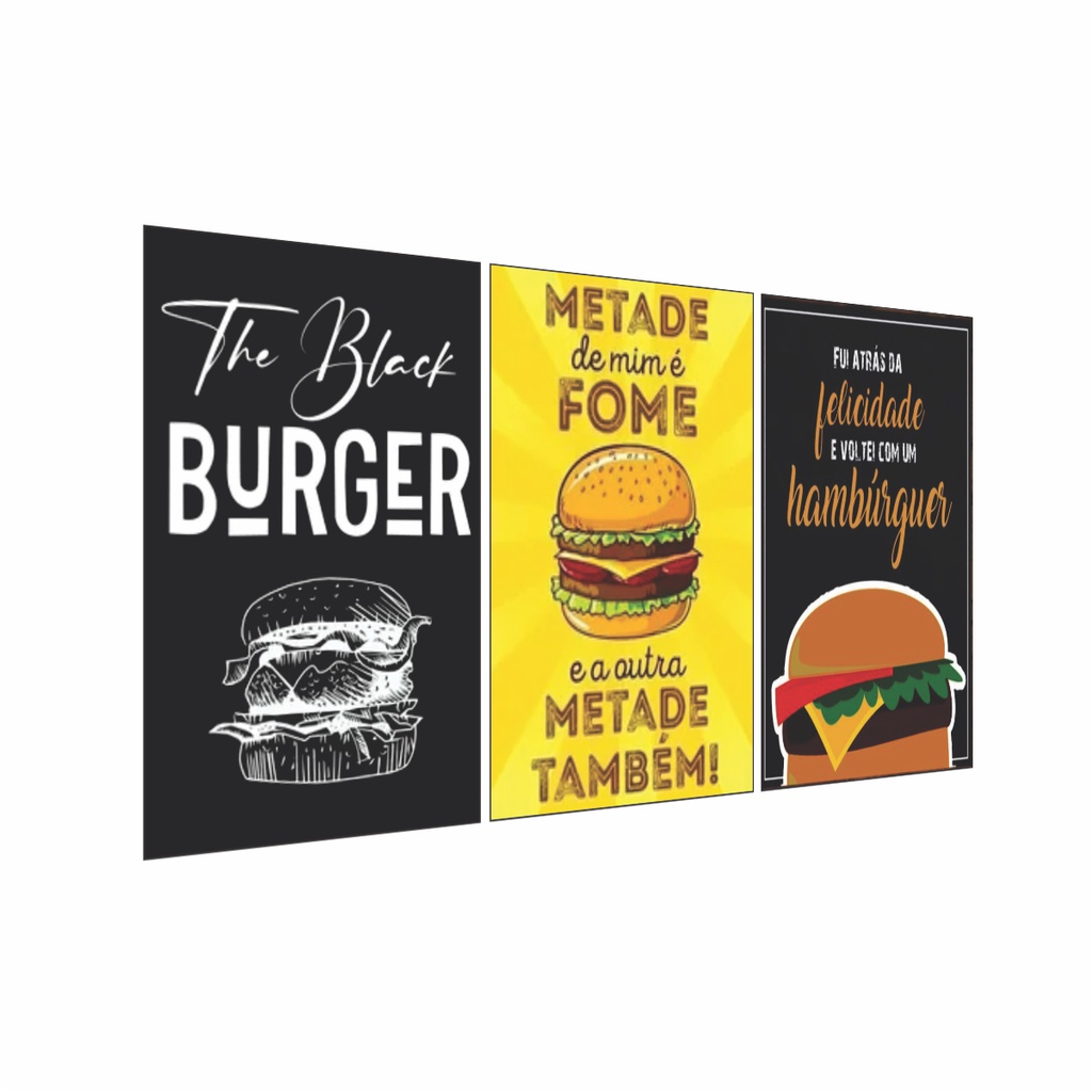 Quadro Decorativo Kit 03 Peças Hambúrguer Frases Para Lanchonete Bar Restaurante Sem Moldura