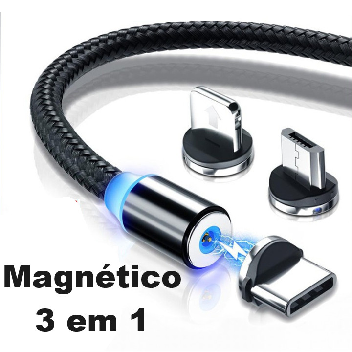 Cabo USB Carregador Magnético 3 EM 1 Para Todos Modelos de Celular Entrada V8 Tipo C iOS