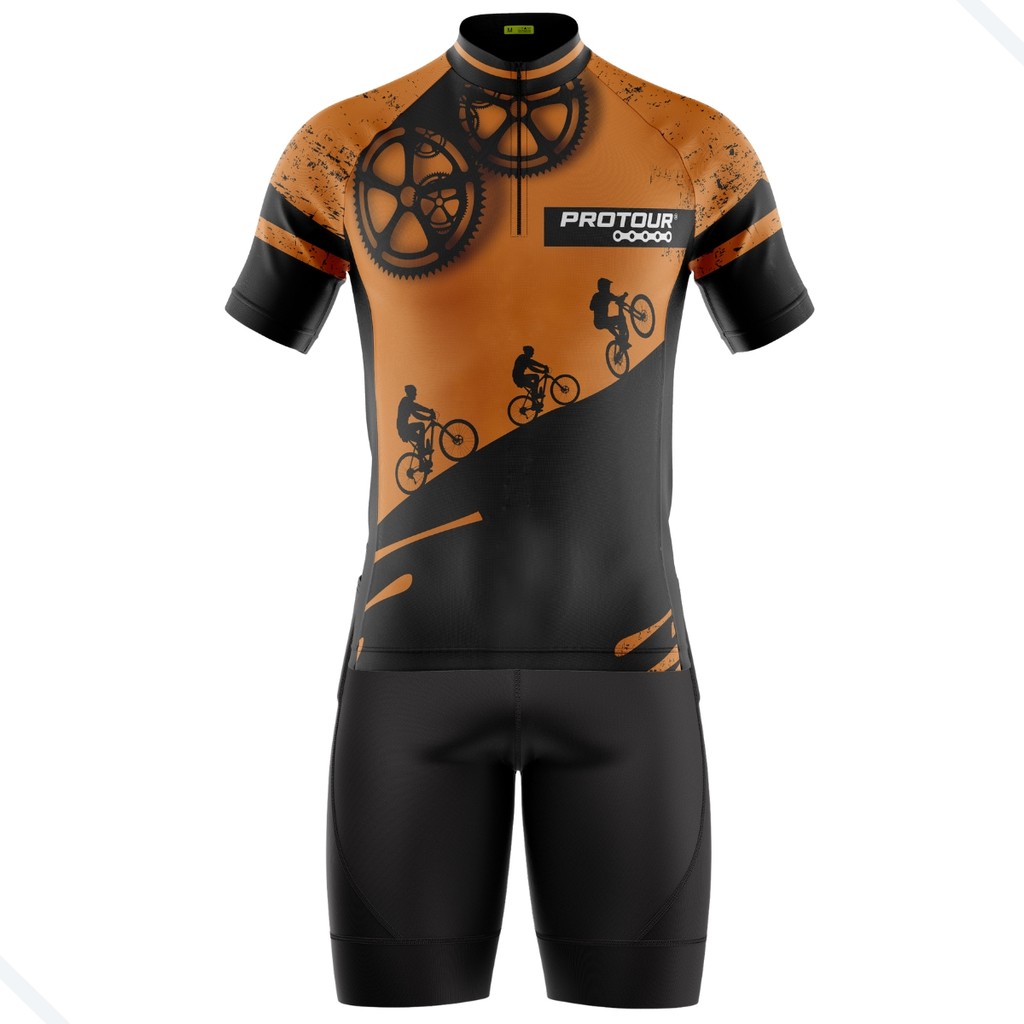 CONJUNTO CICLISMO BERMUDA E CAMISA RESPEITE O CICLISTA PRO TOUR LARANJA COM BOLSOS UV 50+