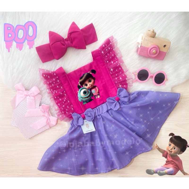 Romper Boo Monstros S.A Body Fantasia Vestido Salopete Infantil Bebê Menina Mesversario Aniversário
