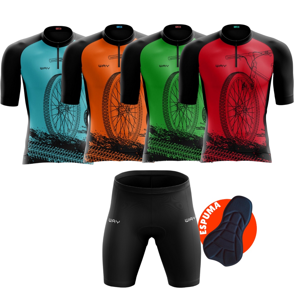 Conjunto de Ciclismo Camisa Bike Roda Azul Vermelho Laranja e Verde e Bermuda Acolchoada em Espuma Confortável Ideal para Pedalar