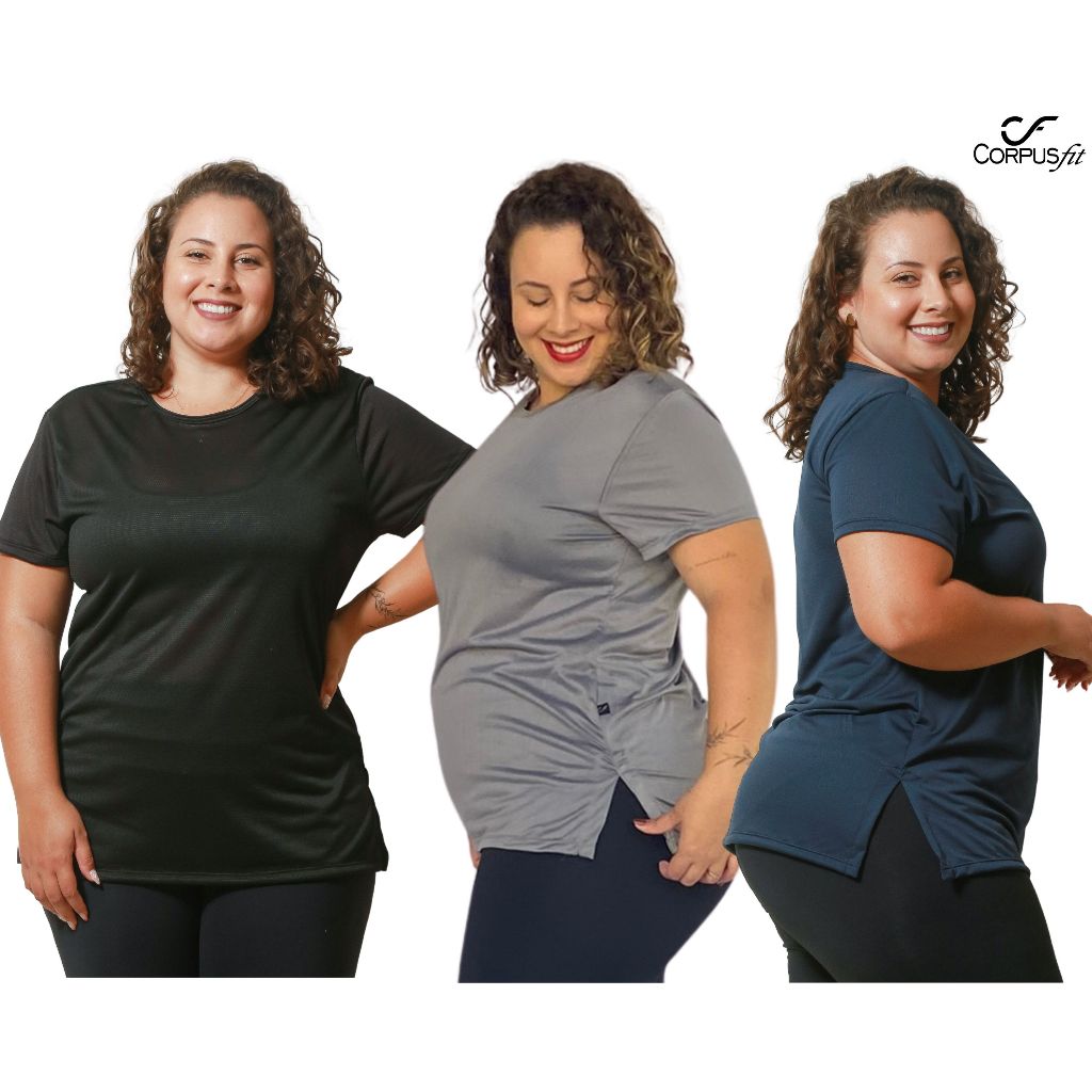 Blusa Dry Fit Plus Size Feminina Roupa de Academia Tapa Bumbum Para Treino Kit com 3 Blusinhas Curve