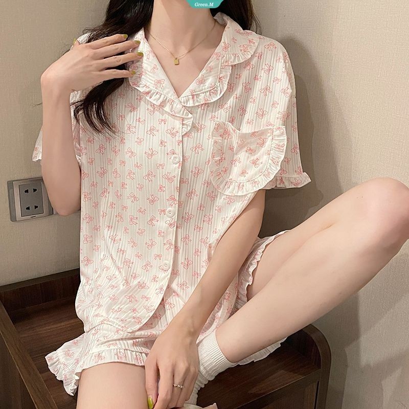 Modelos De Verão Meninas Cardigan Loose Light Pink Girls Sweet Home Wear Pijamas Shorts De Manga Curta Seção Fina Anti-mosquito Respirável Confortável Dormitório Estudantil [GM]
