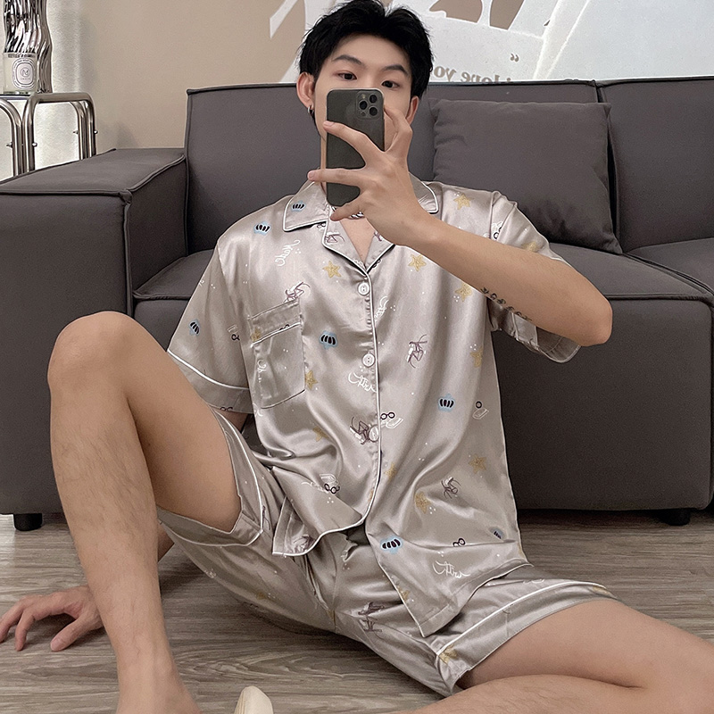Pijamas de Seda Gelo Homens Estudantes Adolescentes de Manga Curta de Verão Homens de Verão Podem Usar Fora de Casa de Tamanho Grande Estilo Fino