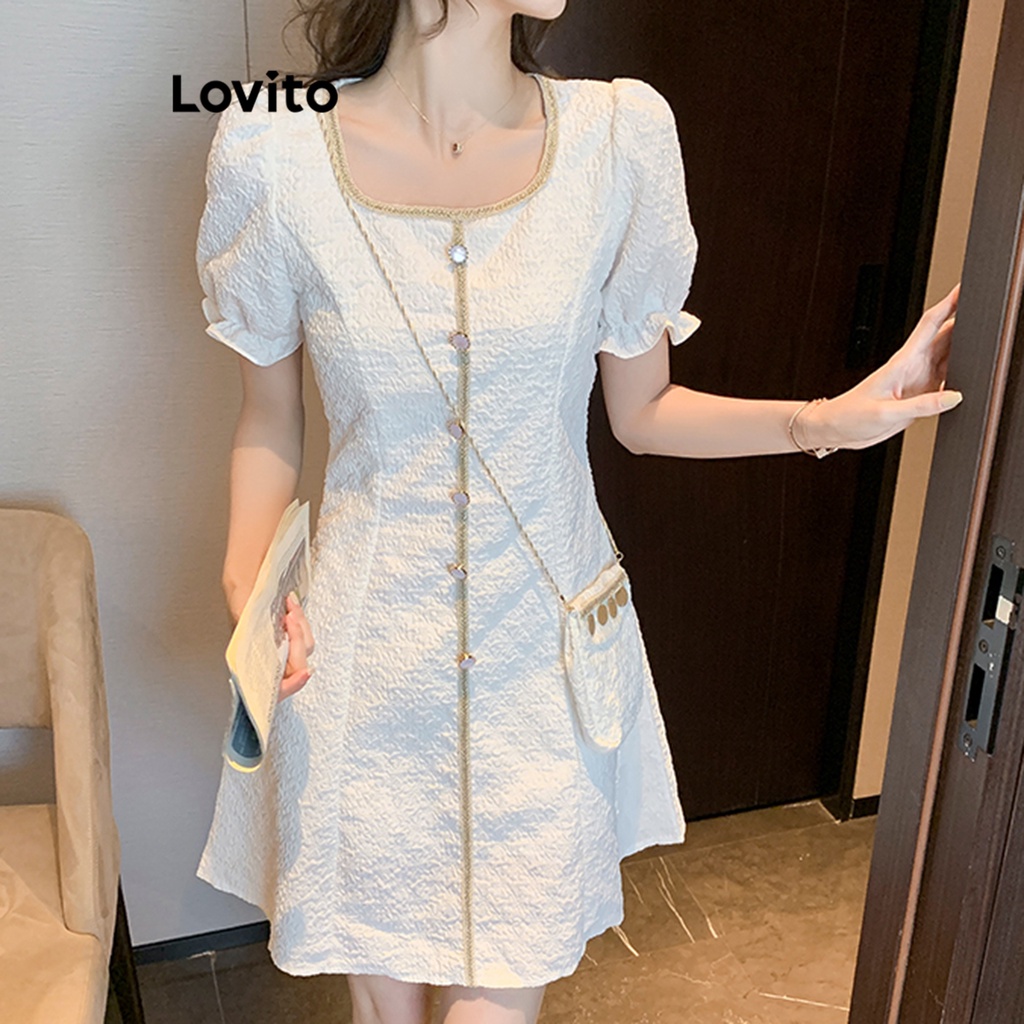 Lovito Casual Vestido com Mangas Bufantes, Botões e Contraste para Mulheres LNE19053 (Branco)