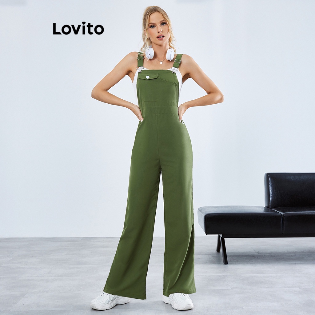 Lovito Macacão Casual Liso com Bolsos e Botões Frontais para Mulheres L54ED117 (Verde Militar)