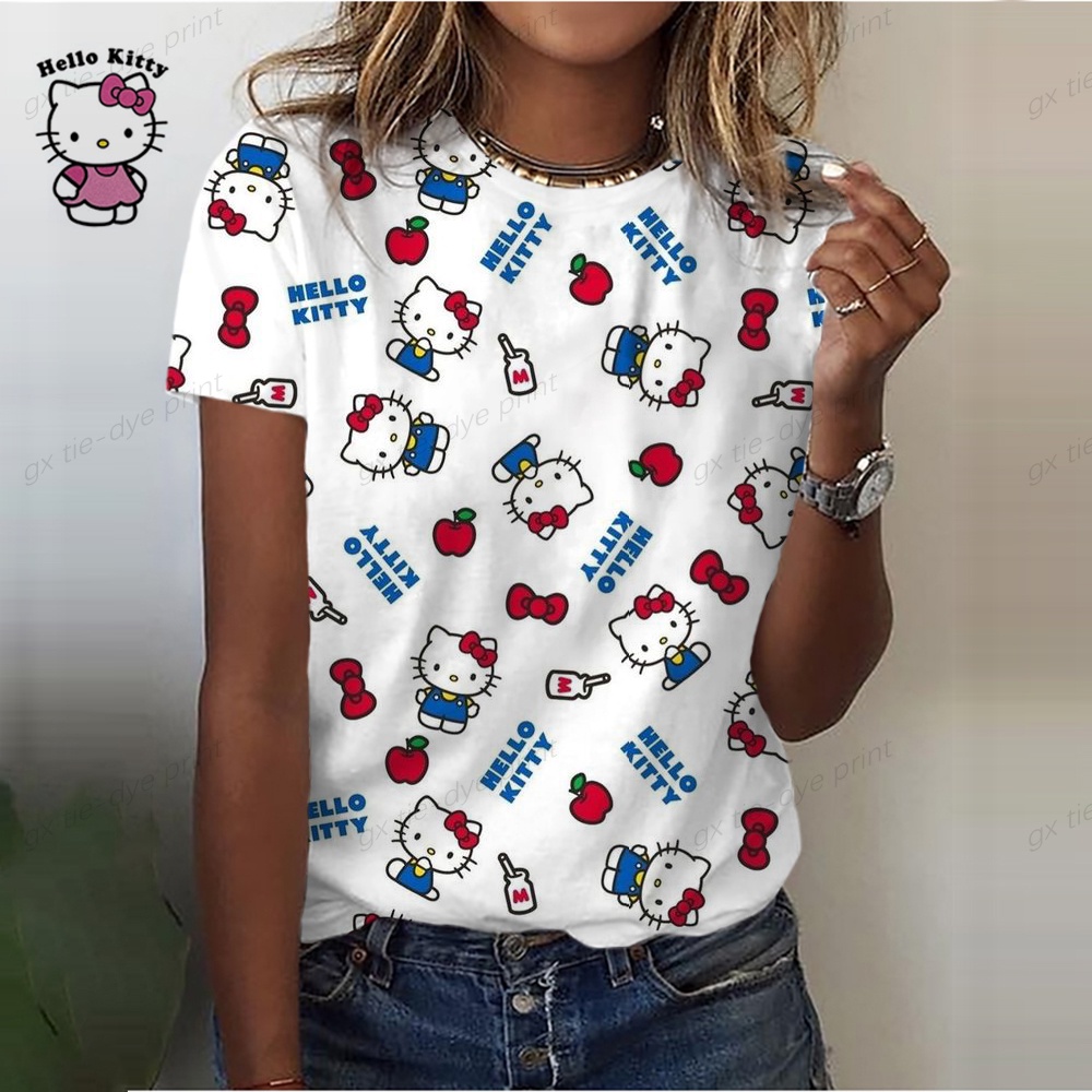 Camiseta De Moda Feminina De Verão Nova O Pescoço Casual Hello Kitty Impressa Regular Street Femmes Wear