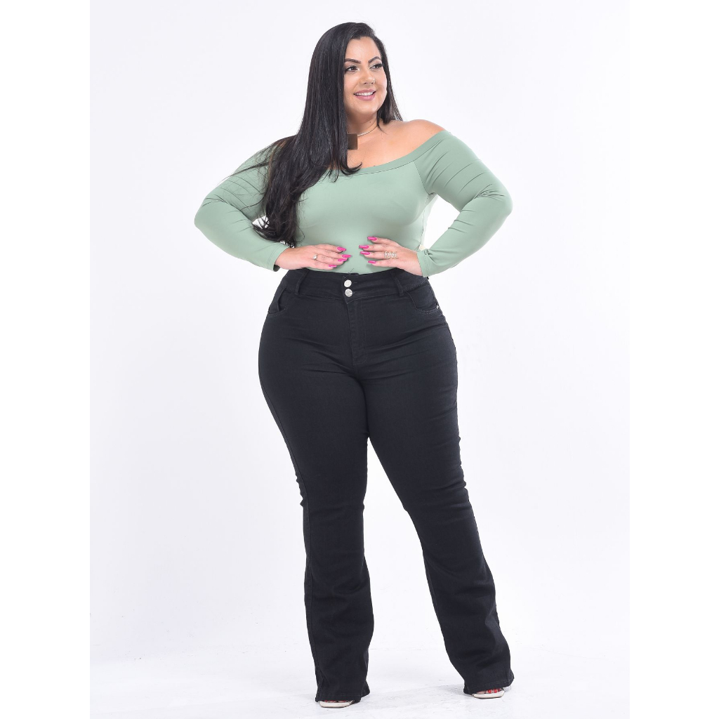 calça jeans feminina plus size flare preta cintura alta com lycra