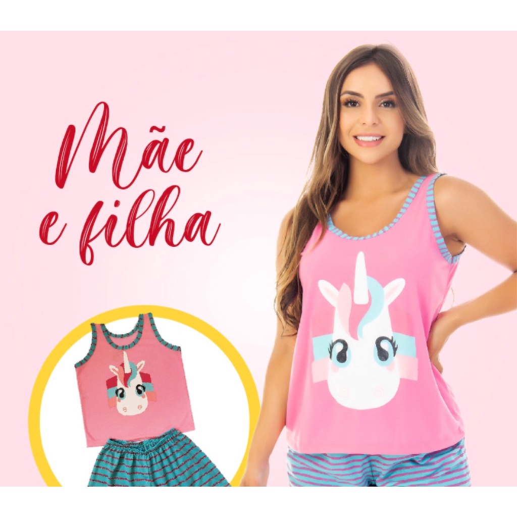 Baby Doll Mãe e Filha Unicórnio Regata Pijama Feminino Curto Verão Barato