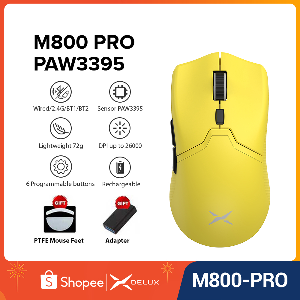 Delux M800 PRO PAW3395 Rato De Jogo DPI MAX 26000 Com Fio 2.4G Bluetooth Sem 500mAh Recarregável Programável 72g Leve Para PC/Laptop/Windows Cor Amarela