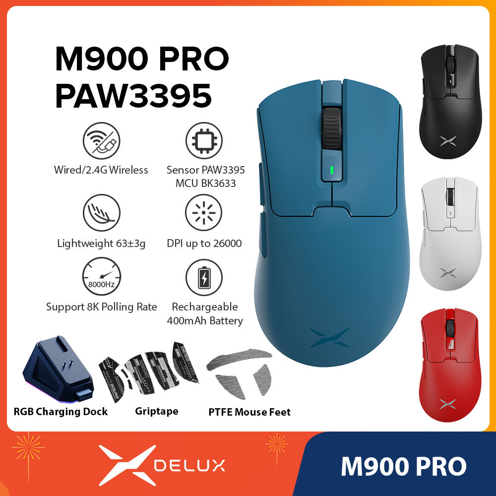 Delux M900 PRO PAW3395 Mouse Para Jogos Azul DPI MAX 26000 Com Fio 2.4G Sem Recarregável Base De Carregamento Magnética