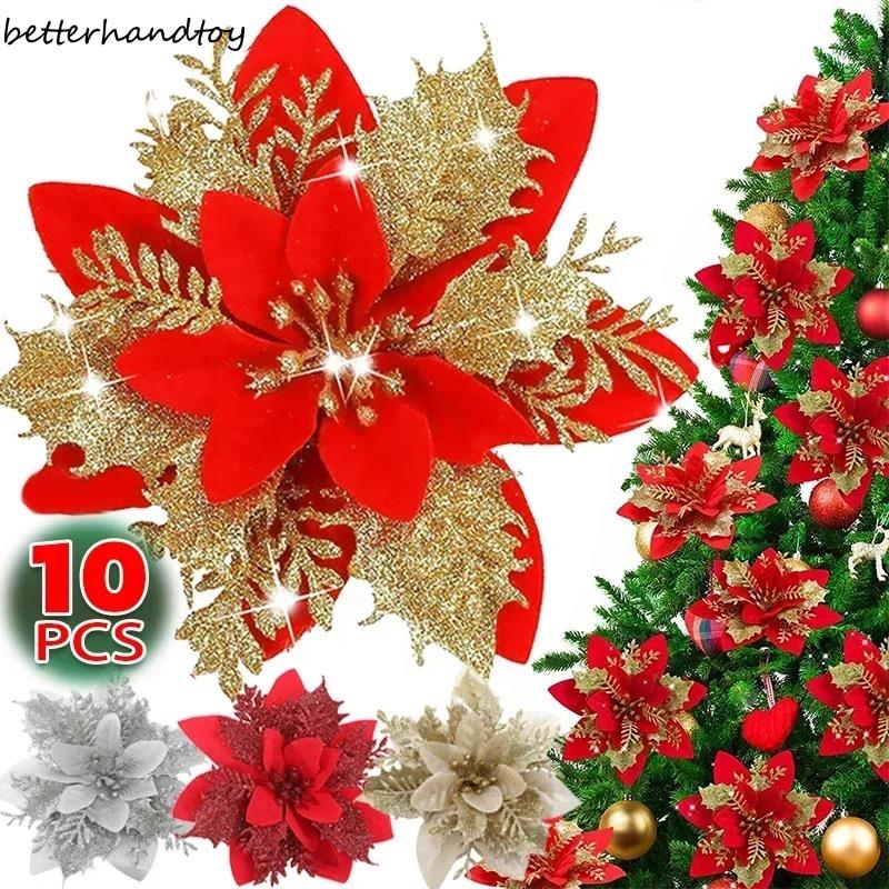 10pçs Flor Artificial Árvore De Natal Glitter Decoração De Natal Presente De Ano Novo..