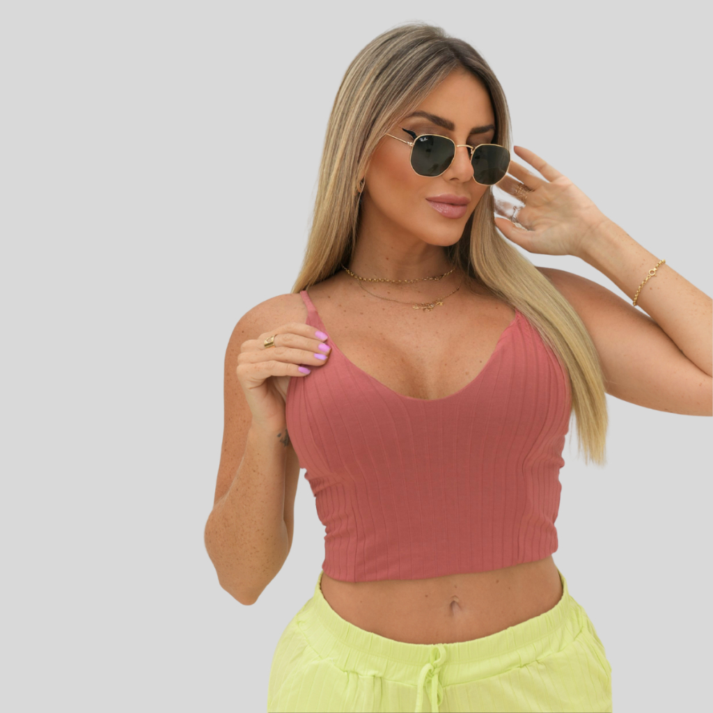 Cropped Slim Feminino de Alça Fina Malha Canelada Com Bojo Bruna